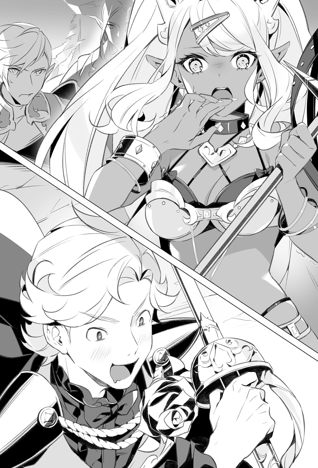 Saburou shows a vulgar smile, and looks at the elves as if licking them all over.