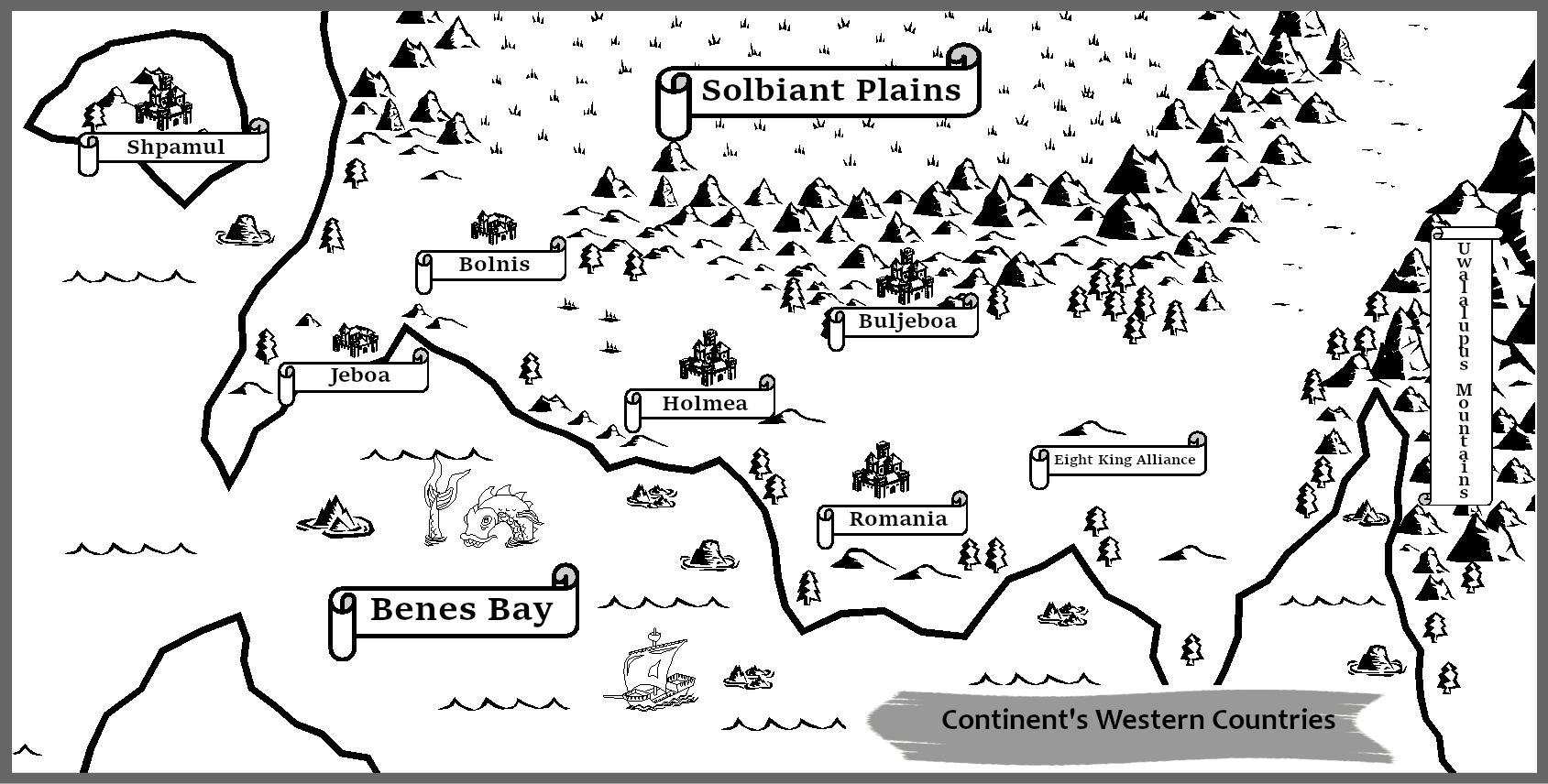 And then, further to the west than the western central part, Ocean State Jeboa which prospered through the sea trade in the Benes Bay. If you went even further west, you would find a kingdom called Shpamul on an island in the ocean.