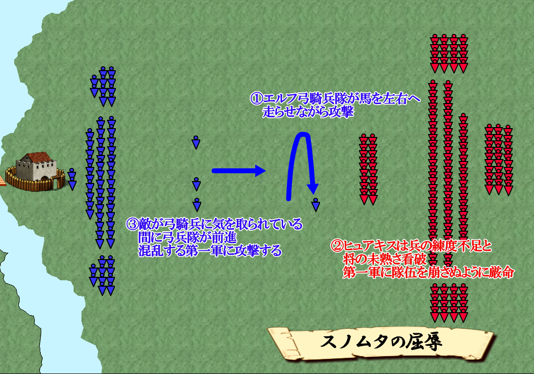 Hiakis summoned a runner and gave him the following instruction: “Message to General Rakius! Tell him to calm down and reinforce his defenses. Don’t get tricked by horse-riding. As long as your defenses don’t fall apart, it makes no difference whether quick-footed archers run about while shooting their arrows. Rather than that, keep your attention to the front!”