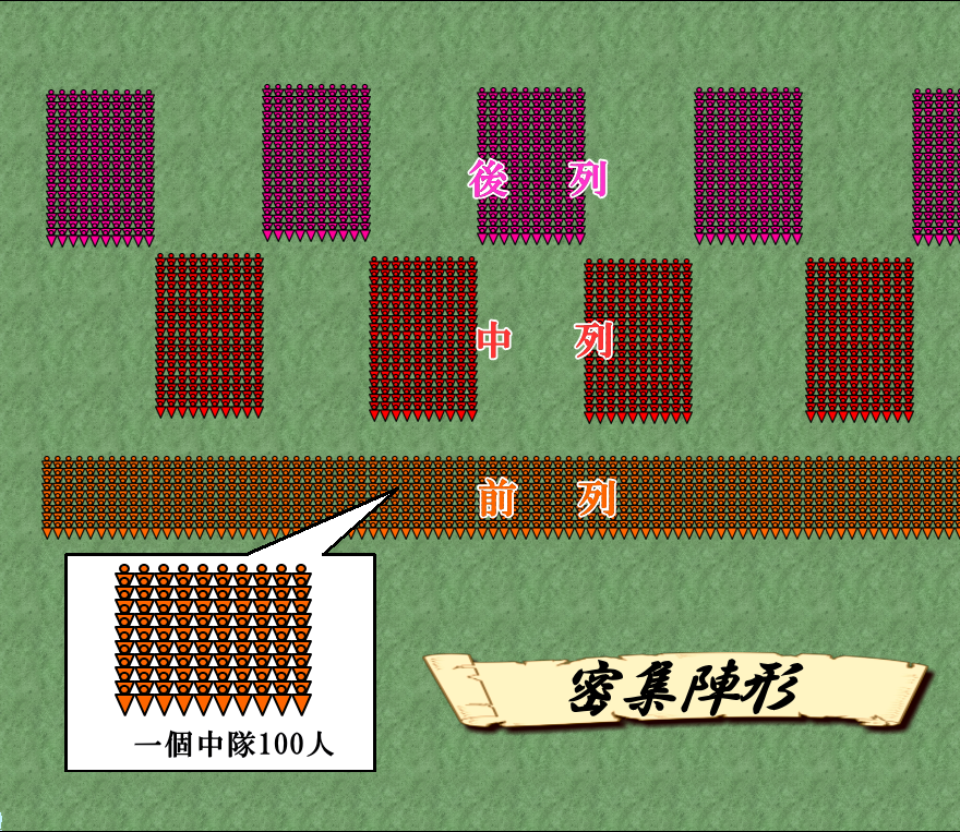 First off, the front row was forming a long, horizontal line. Its foundation was made up of thirty companies, each consisting of a hundred heavy spear infantrymen which were arranged in a 10 x 10 men square.