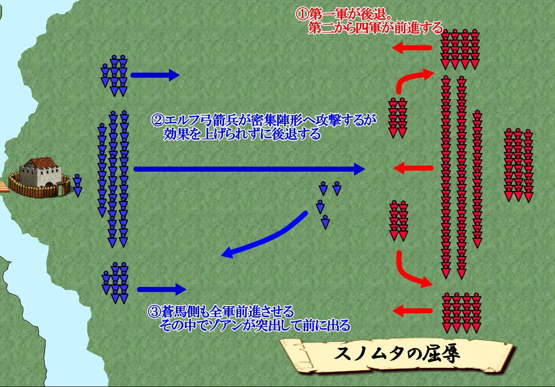 The archer cavalry in front would use their Elfin Bows to fire the arrows straight ahead while the archers on foot behind them would aim at the Second Division by firing their arrows in a high-angle curve.