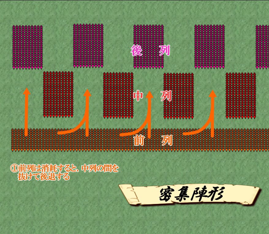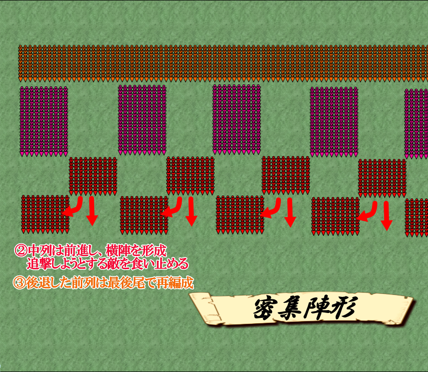However, the gaps in the mid-row allowed for the front row soldiers to fall back to the rear of their allies on the smallest possible route. On top of that, the mid-row soldiers would be able to hold back the pursuing enemy soldiers. In addition, this would also expose the enemy to a dire threat as they would run into fresh, perfectly prepared troops during their pursuit while being fairly exhausted themselves after all the fighting against the front row.