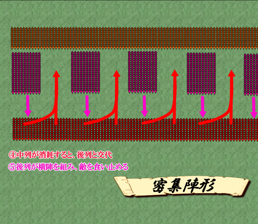 The reason why the mid and rear rows were deployed in a grid pattern instead of a continuous, horizontal formation like the front row was an attempt to supplement this flexibility. Because there was a big space between the two-company-units, those units could freely maneuver around in accordance to the battle situation.