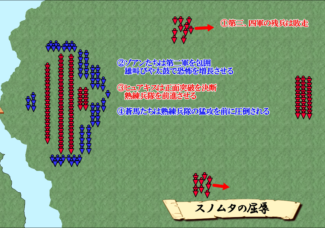 But, what should actually be lauded here is the fact of the Divine Son of Destruction having created a situation on the battlefield that allowed his small force to encircle a large enemy force. For this very reason, the 「Battle of Sunomuta」 is referred to as the crystallization of Divine Son of Destruction Soma Kisaki’s demonic talent in warcraft.”
