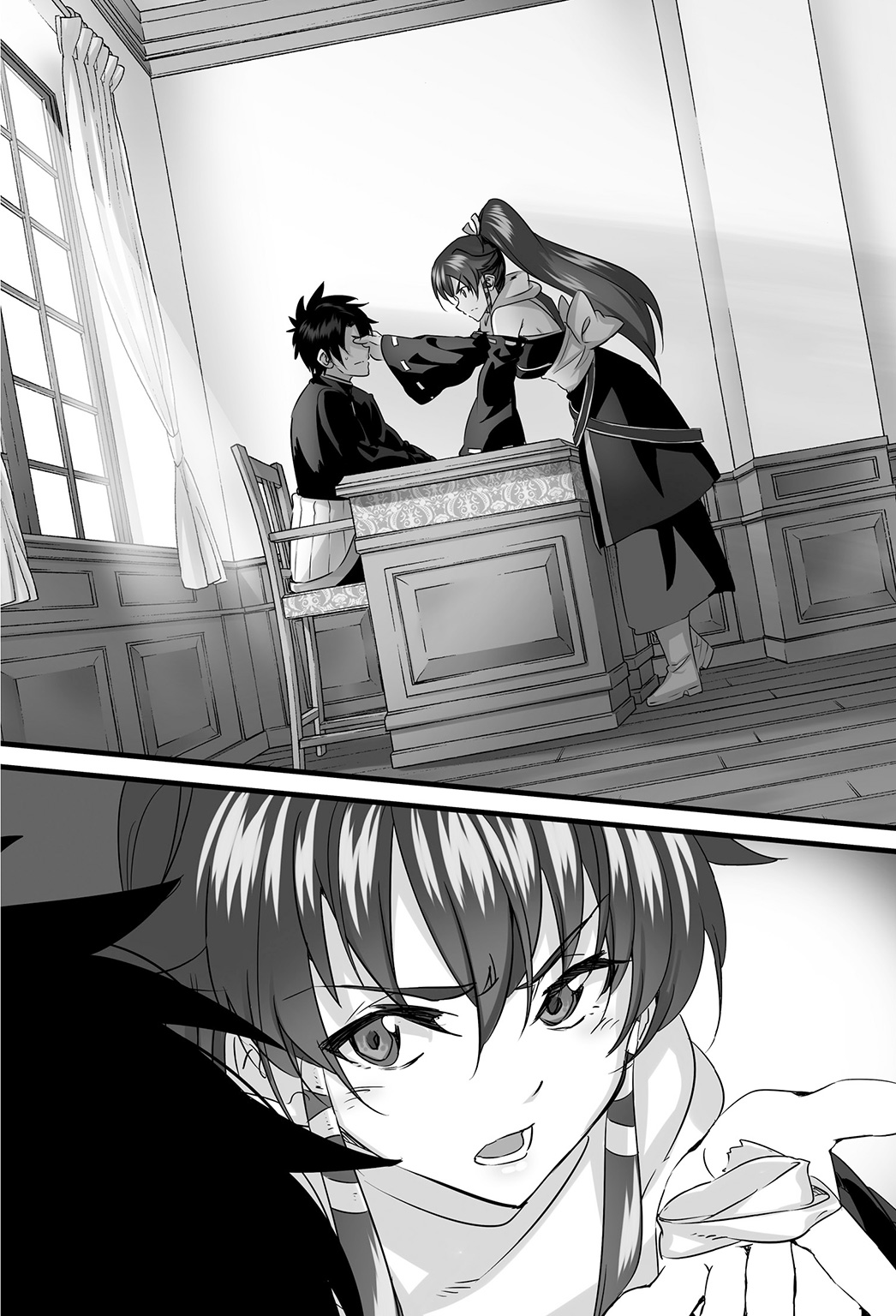 She bent herself forward across the desk, using her hands as supports, and stared at Renya fixedly while bringing her face close to his. Renya couldn’t do anything else other than to silently nod at Shion’s words.