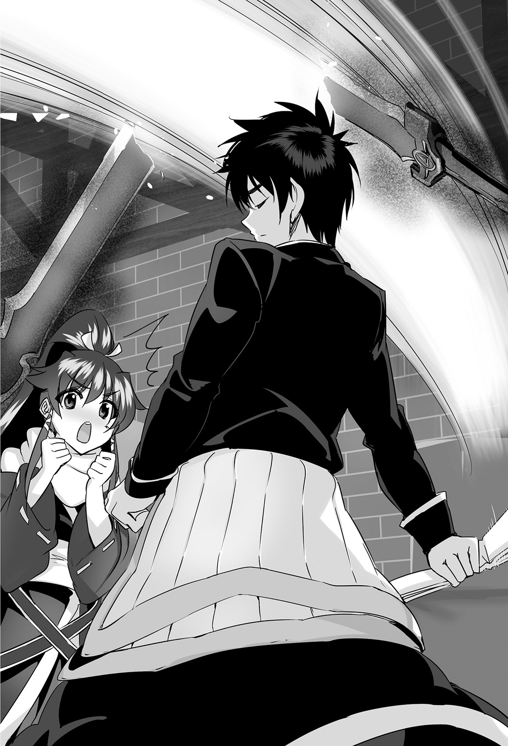 A sudden gust of wind violently swept across the warehouse, probably triggered by the harisen. While Shion pinned down her hair and the hem of her skirt, the magic sword split in half after having the middle of its blade cut, and both pieces dropped to the ground with slightly dry clanks.