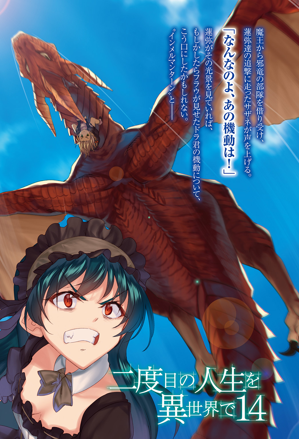 Frau, who was still standing atop Dra-kun’s head, observed that scenery while they circled in the sky above the city. Once she estimated that things would work out one way or another, she directed her eyes to above. Ten-odd evil dragons were flying up there in formation with a conspicuously huge evil dragon in the lead.