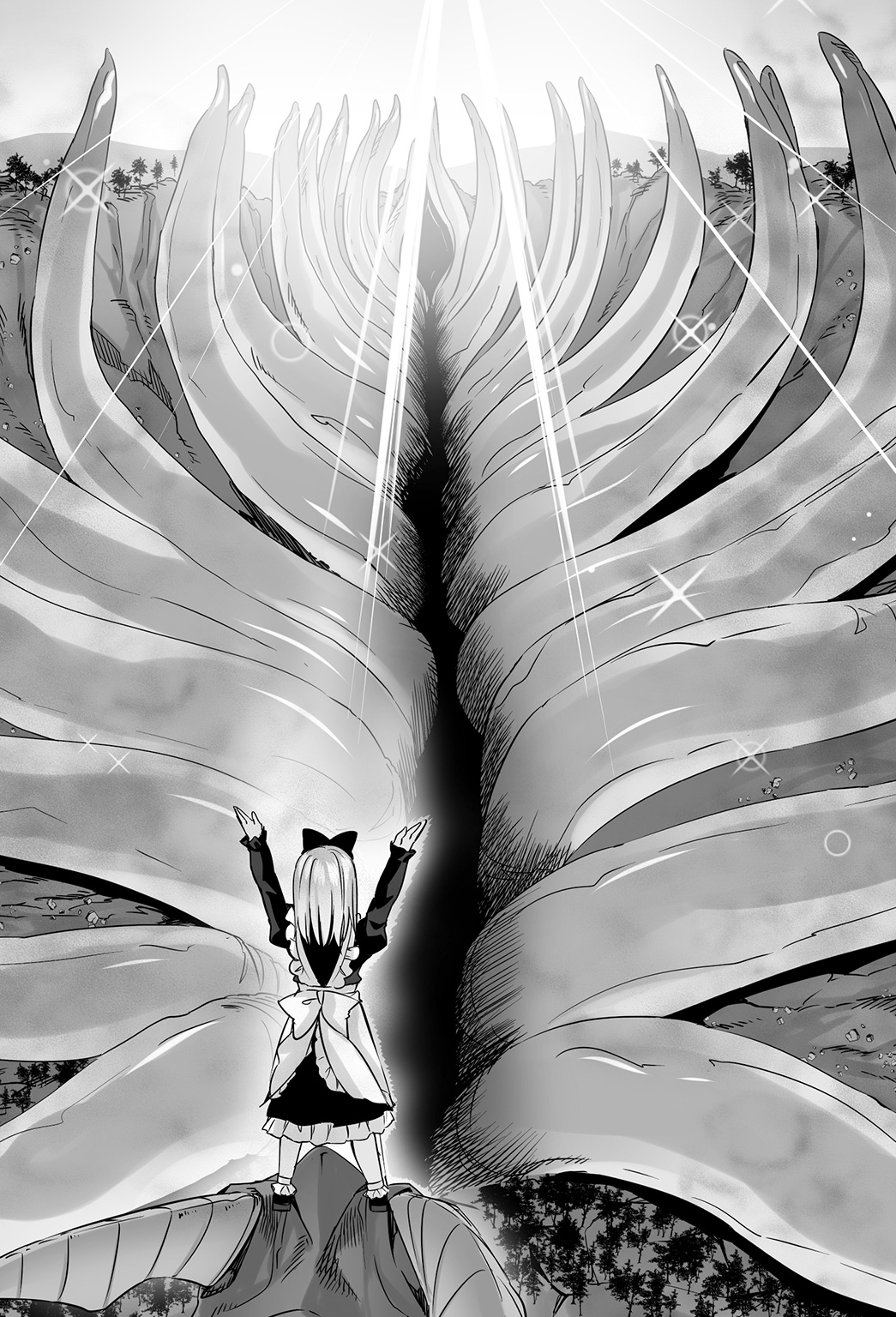 Apparently having heard Frau’s shouted plea, the tentacles, which had been wildly and chaotically wriggling so far, stopped moving all at once. Right after having come to a halt for a moment, the tentacles started to move again, but this time in an orderly pattern. The swarm of tentacles neatly lined up, and before long, slowly parted, beginning to create a huge passage by ripping the ground apart.