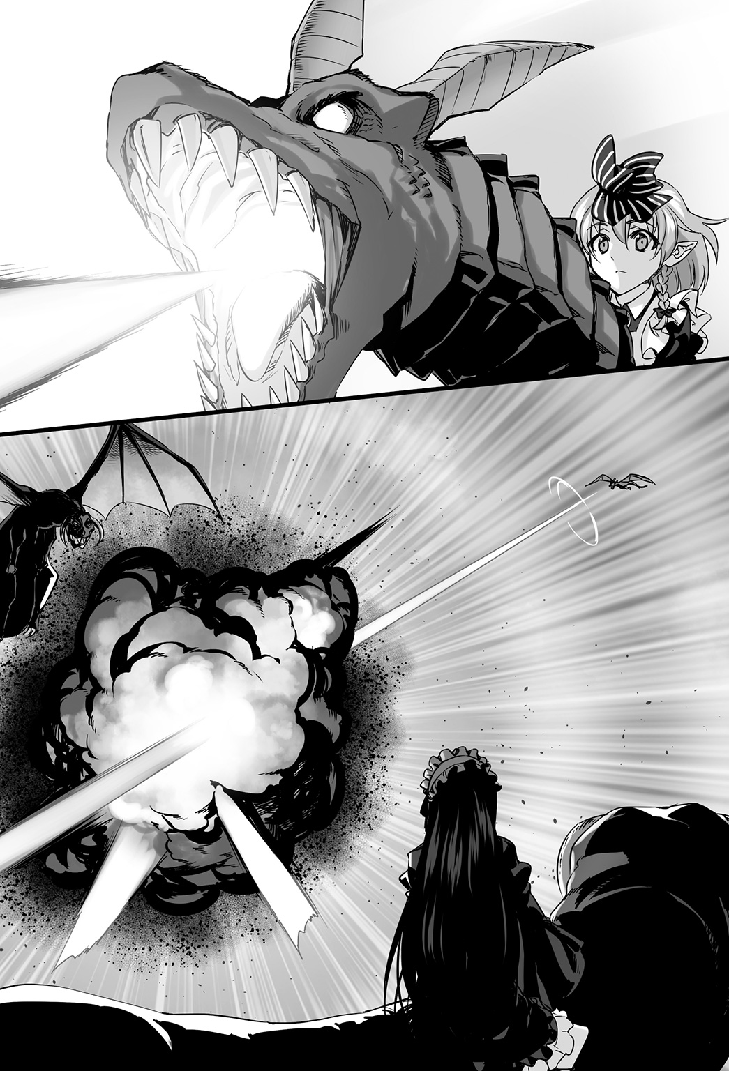 A crimson flash surged out of Dra-kun’s muzzle, but this time the evil dragons focused on evasion, and since they maintained a good distance, Dra-kun’s breath fruitlessly tore through empty space. Frau tensely ground her teeth out of vexation, but because they had to take evasive maneuvers to avoid the counterattacks by the dragons around them, they were in no position to chase after the detached force.