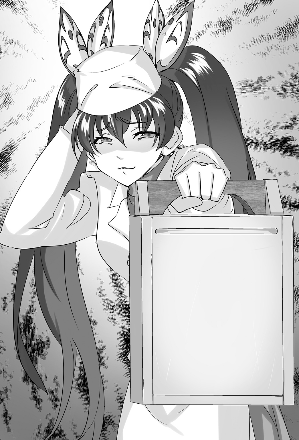 While drawing a beautiful arc as if just barely avoiding to graze the ceiling, she performed one spin in the air, soundlessly and magnificently landed atop the table in the room’s center, folded her knees, and finished it off with a sliding dogeza.