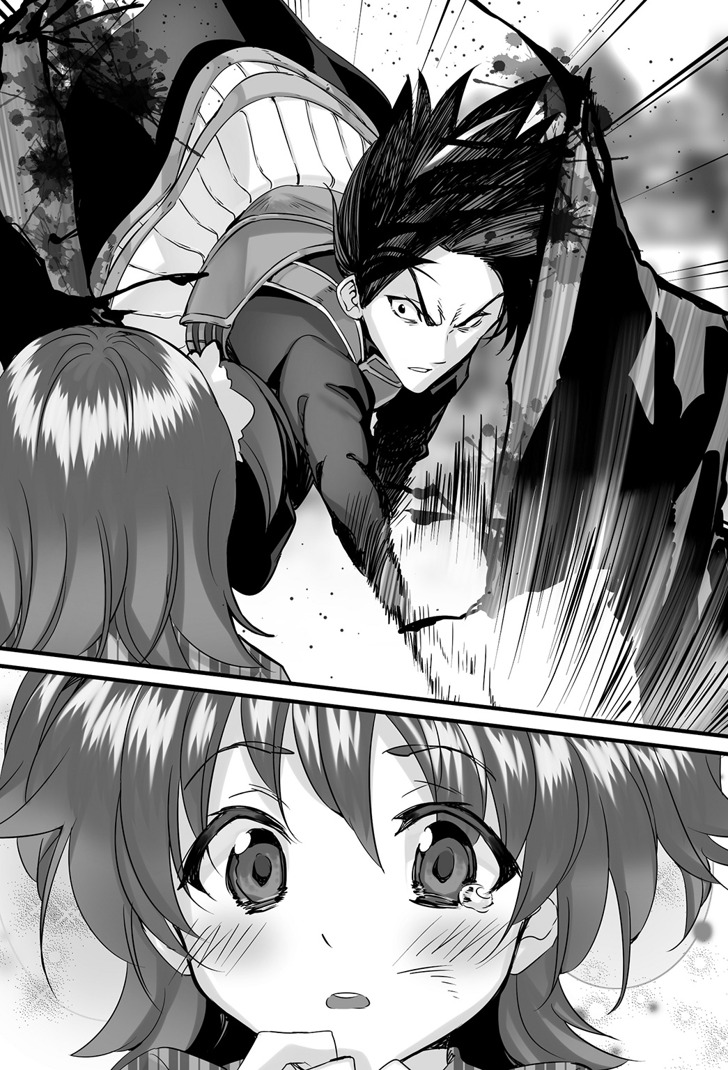 Without sparing the fate of the soldier even a single glance, a young man sheathed his sword after swinging the blade, which didn’t have any blood on it, once. Instead, he looked down at the dragonoid girl, who had light return into her eyes, probably because she got so startled by what happened in front of her, with an expression as if he hadn’t even registered that he pulverized an enemy soldier just moments ago.