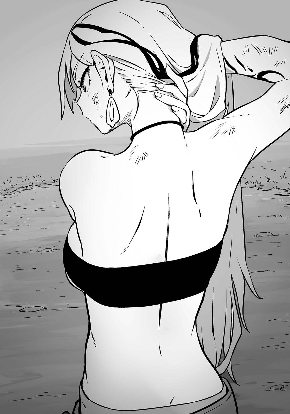 Shea lifts her silver hair, revealing the area from her shoulders to the back of her neck. Since she’s wearing rather revealing clothes to begin with, I can fully see her whole back, let alone her nape.