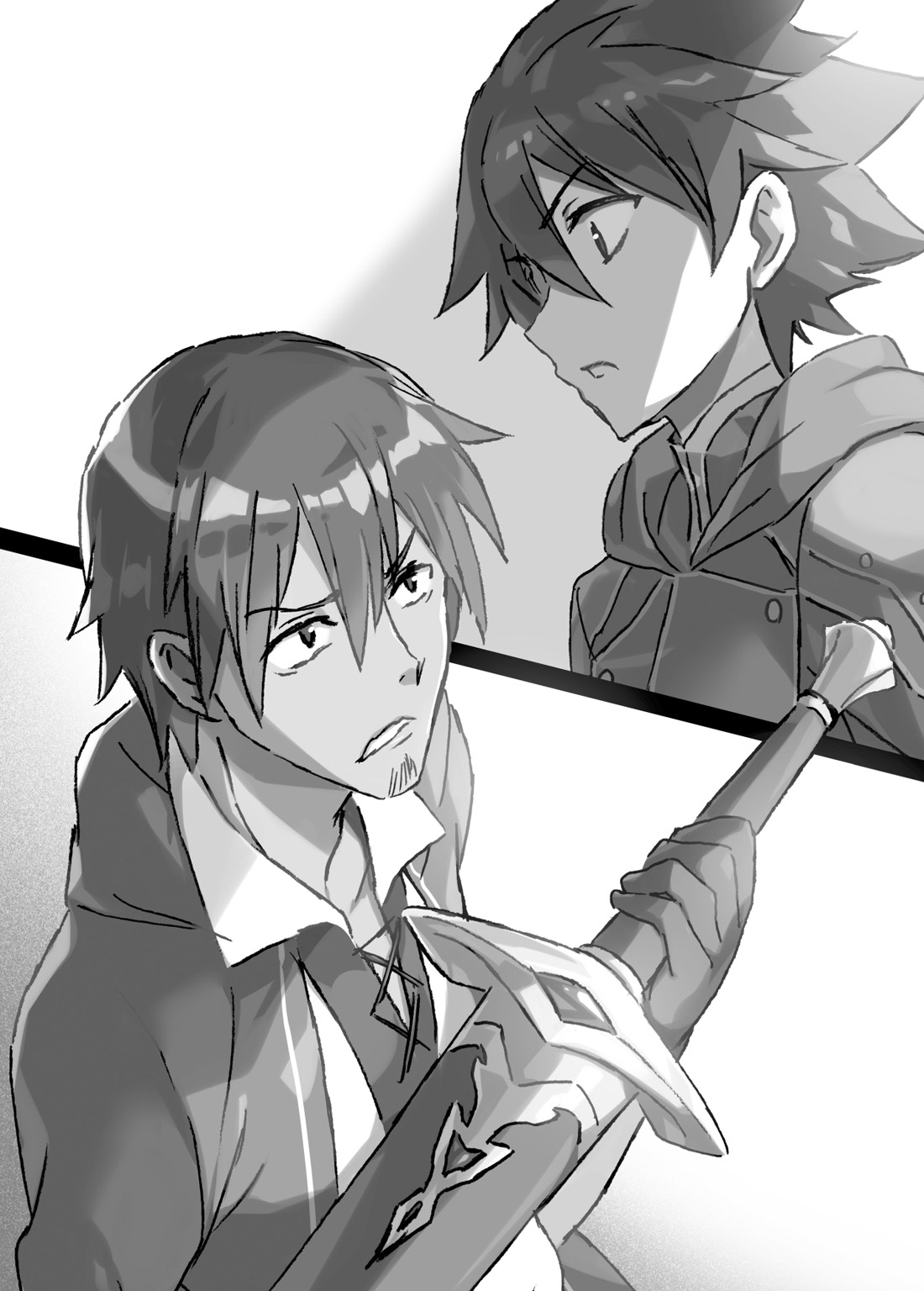 Chrono threw his sword at the same time as Cain raised his face. In a panic, Cain caught the scabbard.