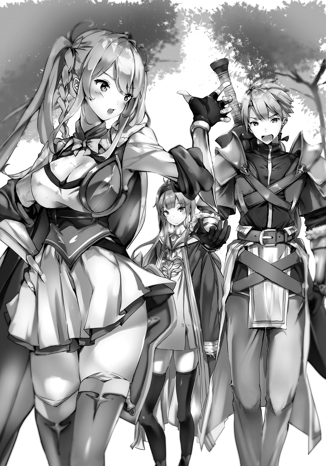 However, just then, a new figure entered the scene―a girl who appeared to be of the same age as the boy. Her glowing golden hair had been tied into pigtails with a few strands on either side having been elaborately knitted into loosely hanging braids. She wore red armor above her clothes while her shoulders and back were covered by a white manteau. But although you could call it armor, it consisted of several disconnected parts, exposing her upper arms and thighs for the whole world to see. In her left hand, she held a small shield which also functioned as a scabbard for her small sword.