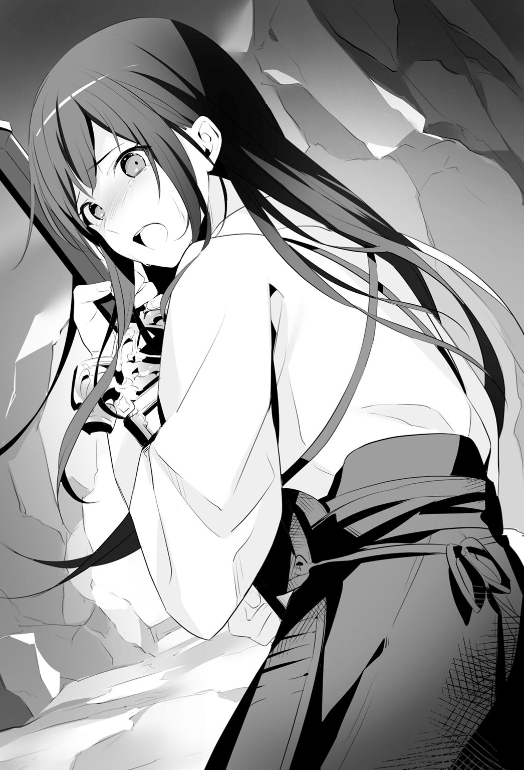 The girl held the sword while crying and ran away along the path she came.