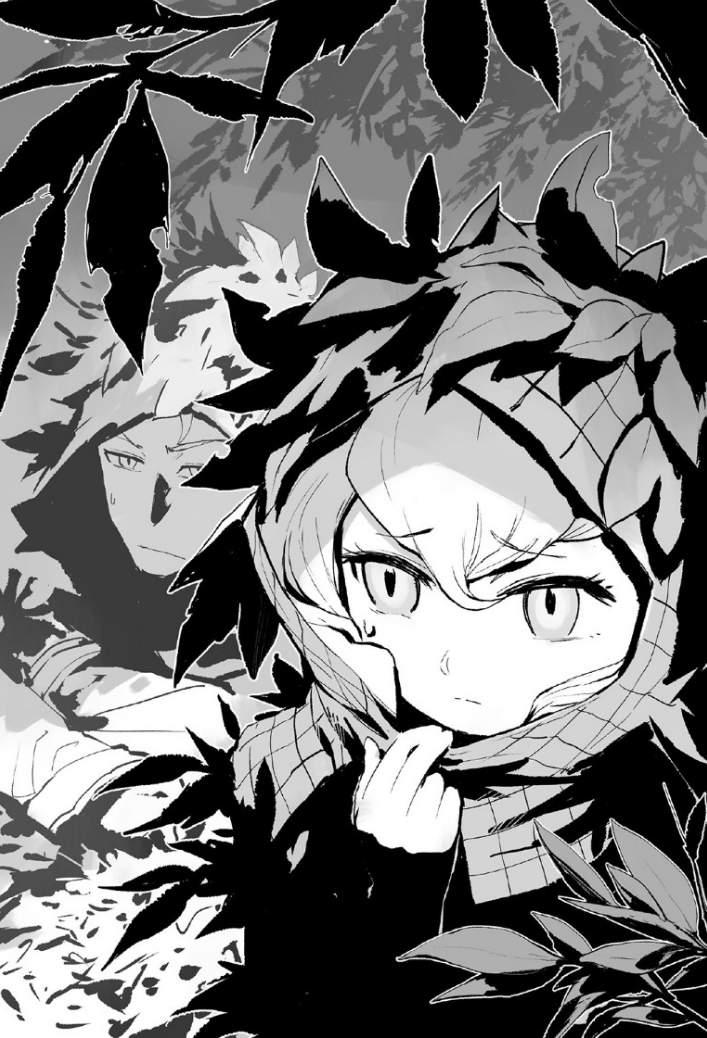Wrapped up in a cloth that had grass and leaves attached to it, Imeraria, who is facing the front while pinching the cloth with her thin fingers, turned a criticizing look towards Sabnak who is next to her in the same attire.